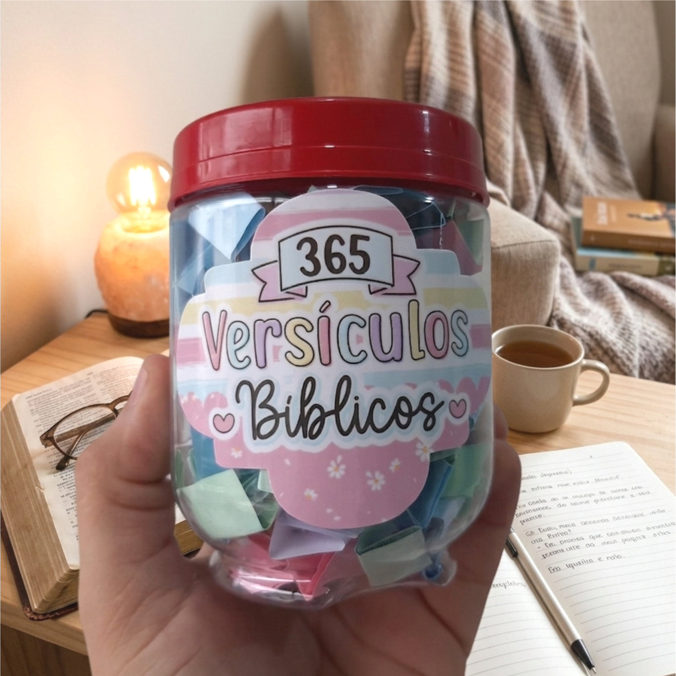 Este lindo potinho é ideal para seu devocional diário. Nele contém 1 versículo bíblico para cada dia do ano!